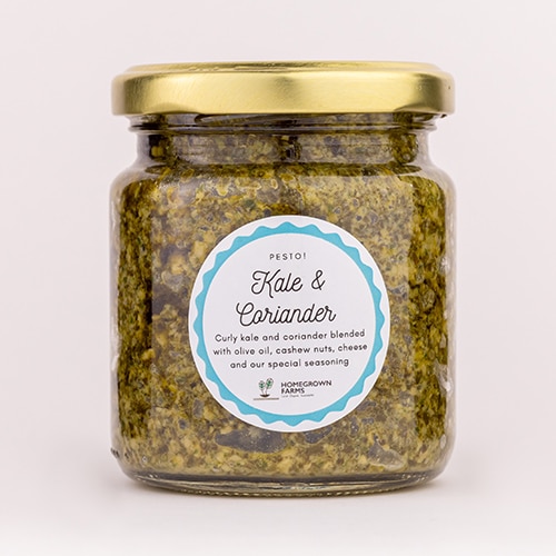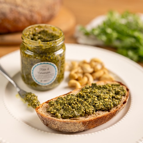 Curly kale and coriander blended with olive oil, cashew nuts, cheese and our special seasoning.